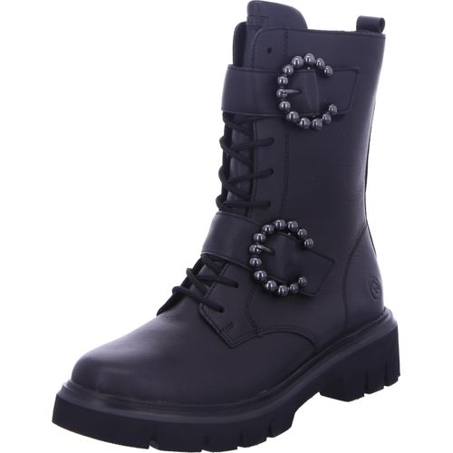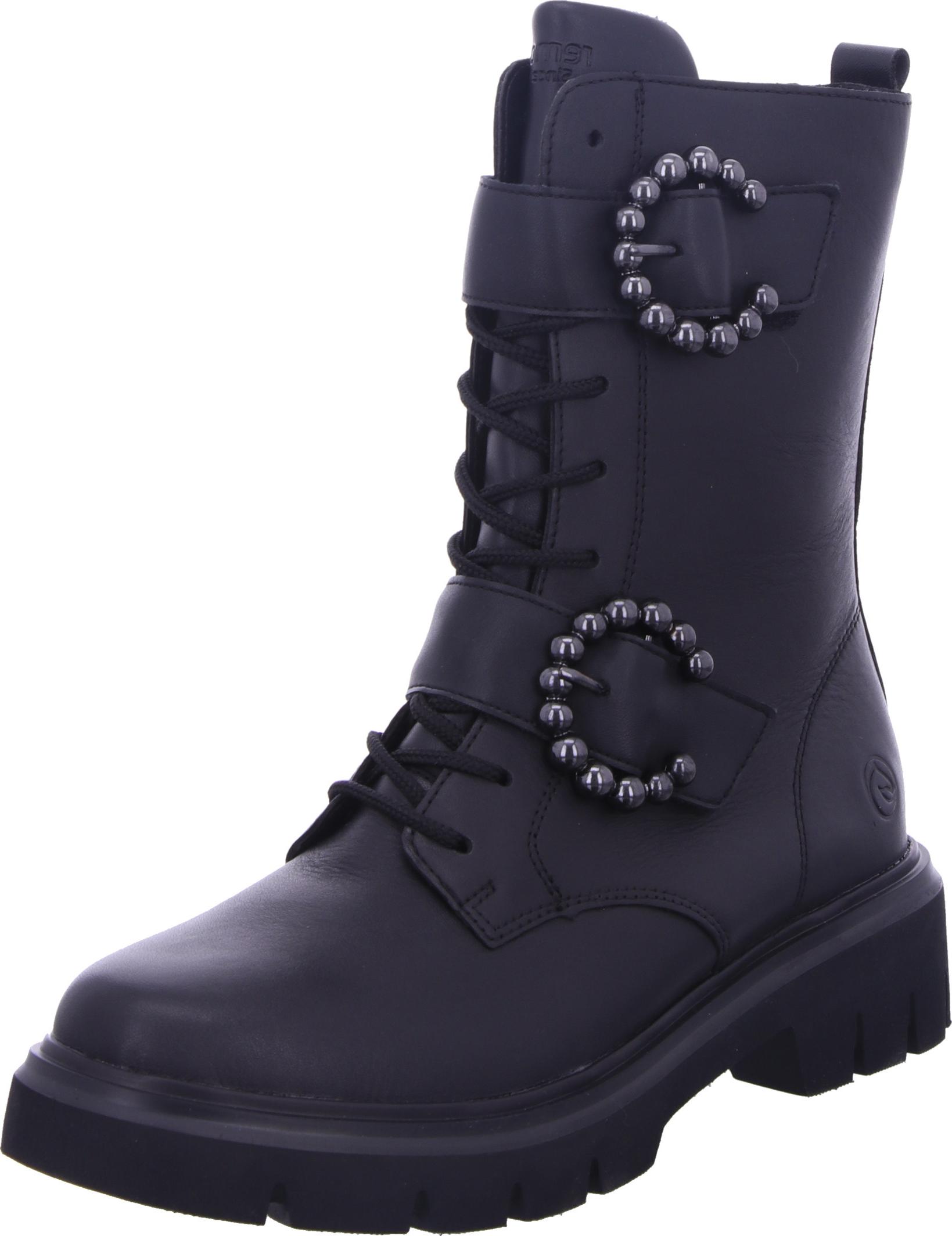 Mit diesen stylischen tiefschwarzen remonte Biker Boots für Damen aus Glattleder lassen sich lange Spaziergänge komfortabel genießen. Die clevere Kombination aus Schnürung und Reißverschluss gibt guten Halt und ermöglicht ein einfaches An- und Ausziehen.