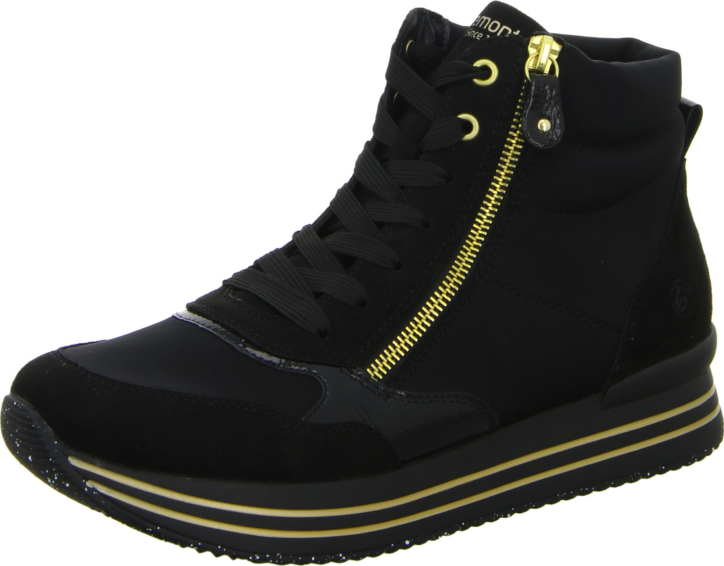 Sportlich und bequem ist dieser Damen Hightop Sneaker von Remonte.Gefertigt aus einem Mix aus Kunstleder und Textil ist er mit Aktzenten in Gold versehen. +