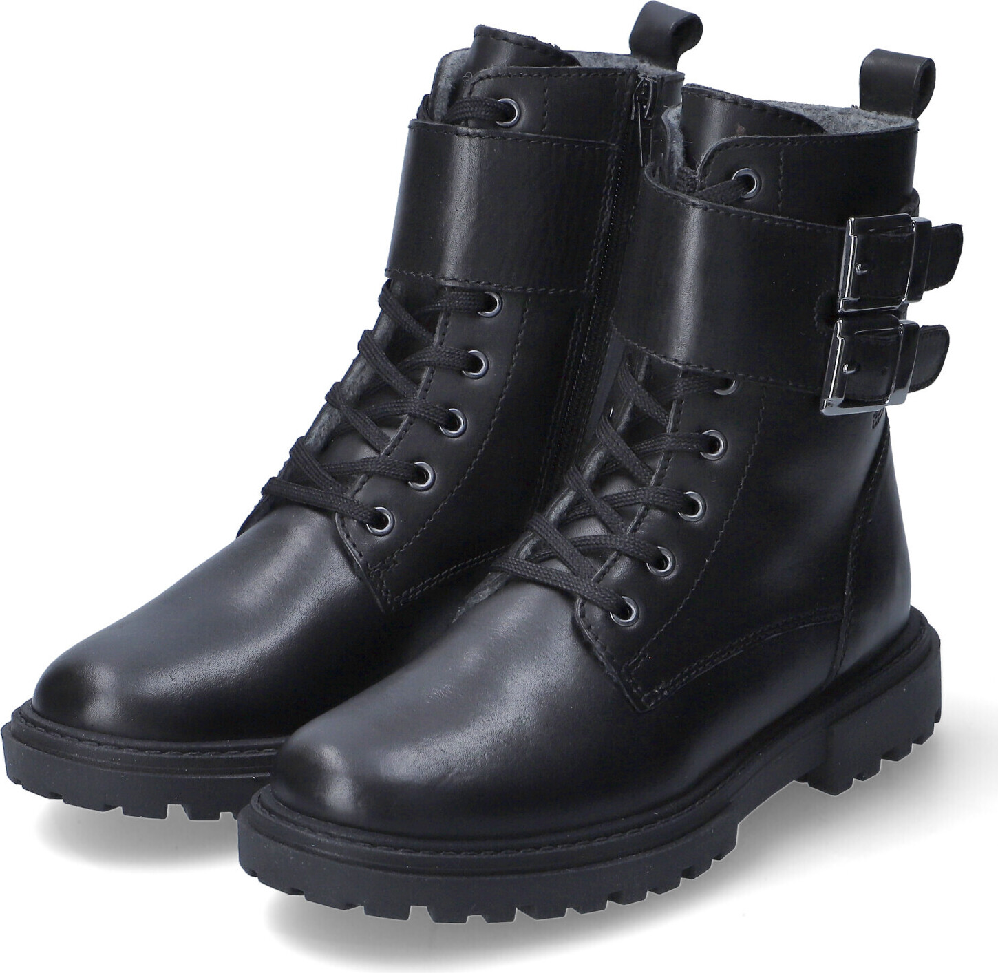Richter Mädchen Combat Boots/ Stiefeletten/ Schnürstiefeletten Schwarz Glattleder - Schnürsenkel - breiter Riemen mit zwei Schnallen - modische Ziernähte - dezente Markendetails - Anziehlasche - leichtes Futter für kalte Tage - gepolsterte Wechseldecksohle - stabile Laufsohle mit Profil - Blockabsatz.