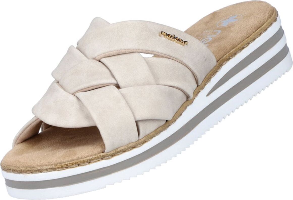 Diese hellbeigen Rieker Pantoletten sind perfekt geeignet für jeden Tag. Der Schuh hat keinen Verschluss und kann so in Windeseile angezogen werden.