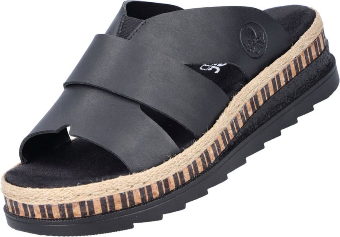 Modisches Design und Bequemlichkeit sind in dieser Damen Pantolette von Rieker vereint.Das Obermaterial aus Kunstleder in Schwarz begeistert durch die schöne Linienführung der Riemen. +
