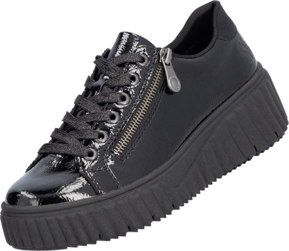 Diese glanzschwarzen Rieker Sneaker Low aus Lackleder sind ein komfortabler Begleiter. Die Schnürung wird durch einen Reißverschluss ergänzt und garantiert somit bestmöglichen Halt und eine perfekte Passform.