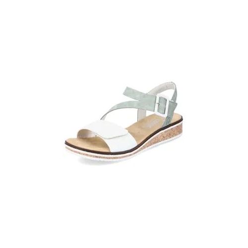 Tauchen Sie ein in den Sommer mit den Rieker Riemchensandalen in frischem Mint-Weiß! Diese eleganten Sandaletten mit Keilabsatz verleihen Ihrem Outfit das gewisse Etwas. Das asymmetrische Riemchen und die Zierschnalle sorgen für einen besonderen Blickfang. +