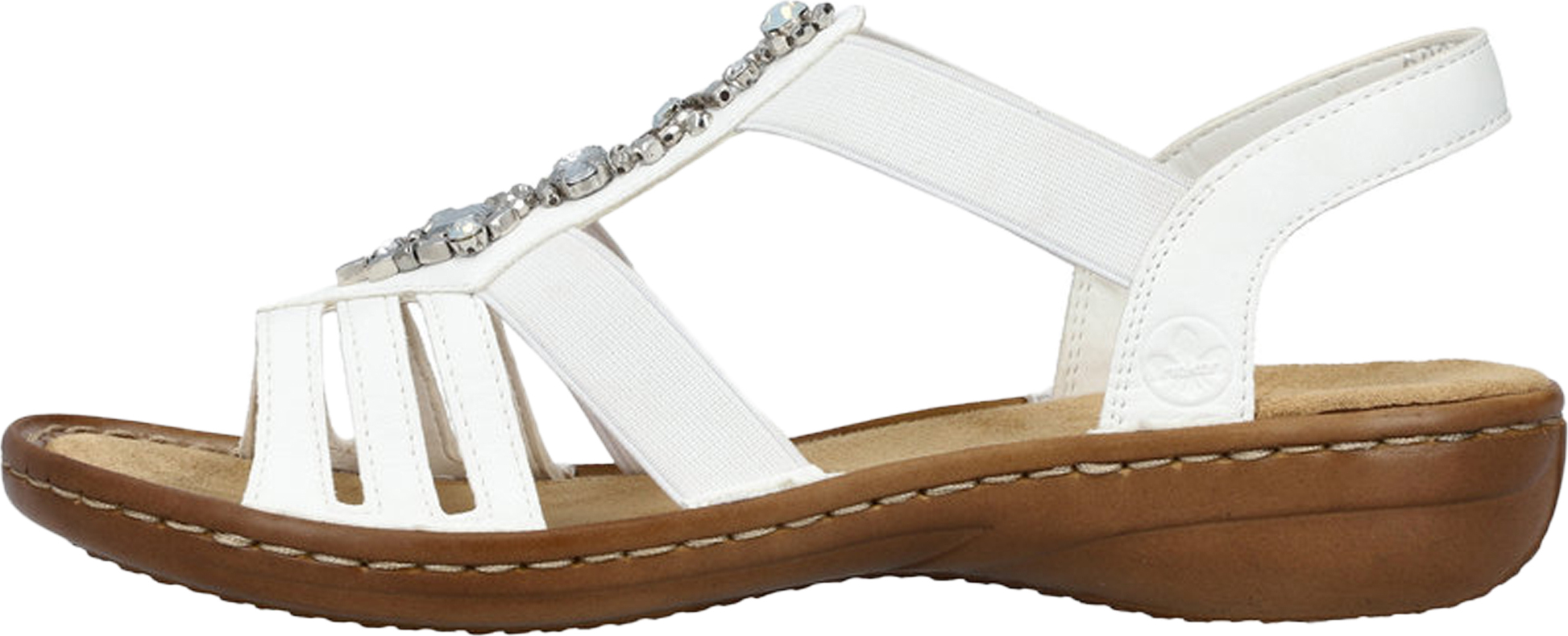Lassen Sie sich vom Glanz und Glamour unserer Rieker Riemchensandale verzaubern! Dieser elegante Sommerschuh in strahlendem Weiß ist mit funkelnden Schmucksteinen besetzt und verleiht Ihrem Outfit das gewisse Etwas. +