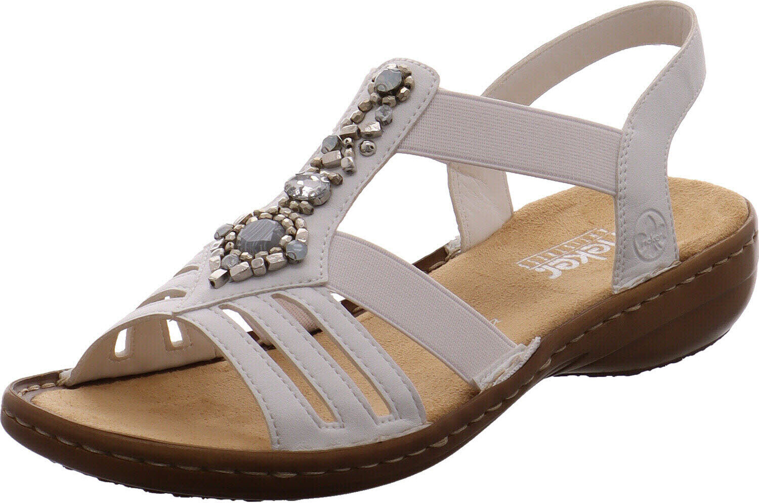 Schick und auffallend anders präsentiert sich diese Damen Sandale von Rieker.Das Obermaterial aus Kunstleder in Weiß fällt besonders durch den mit Glitzersteinen besetzten Rist ins Auge.Die seitlichen Dehngummis erleichtern den Einstieg und das weich gepolsterte Fußbett mit patentierter Antistress Ausstattung macht das Gehen besonders angenehm.Ein Sommerschuh, der zu jedem Outfit eine gute Figur macht.