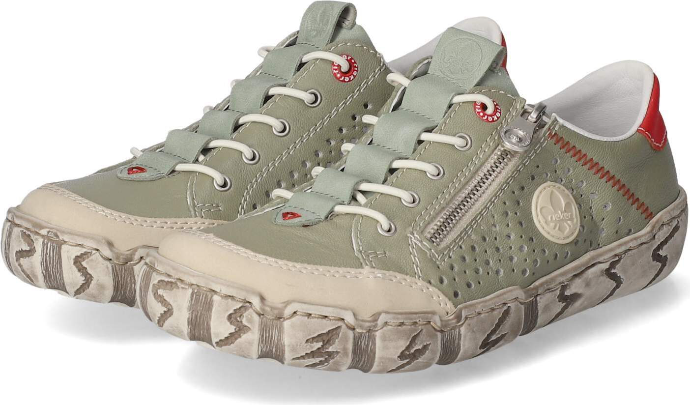 Die grünen Slipper von Rieker aus einem Leder-Synthetik-Mix kombinieren Komfort mit modischen Details. +