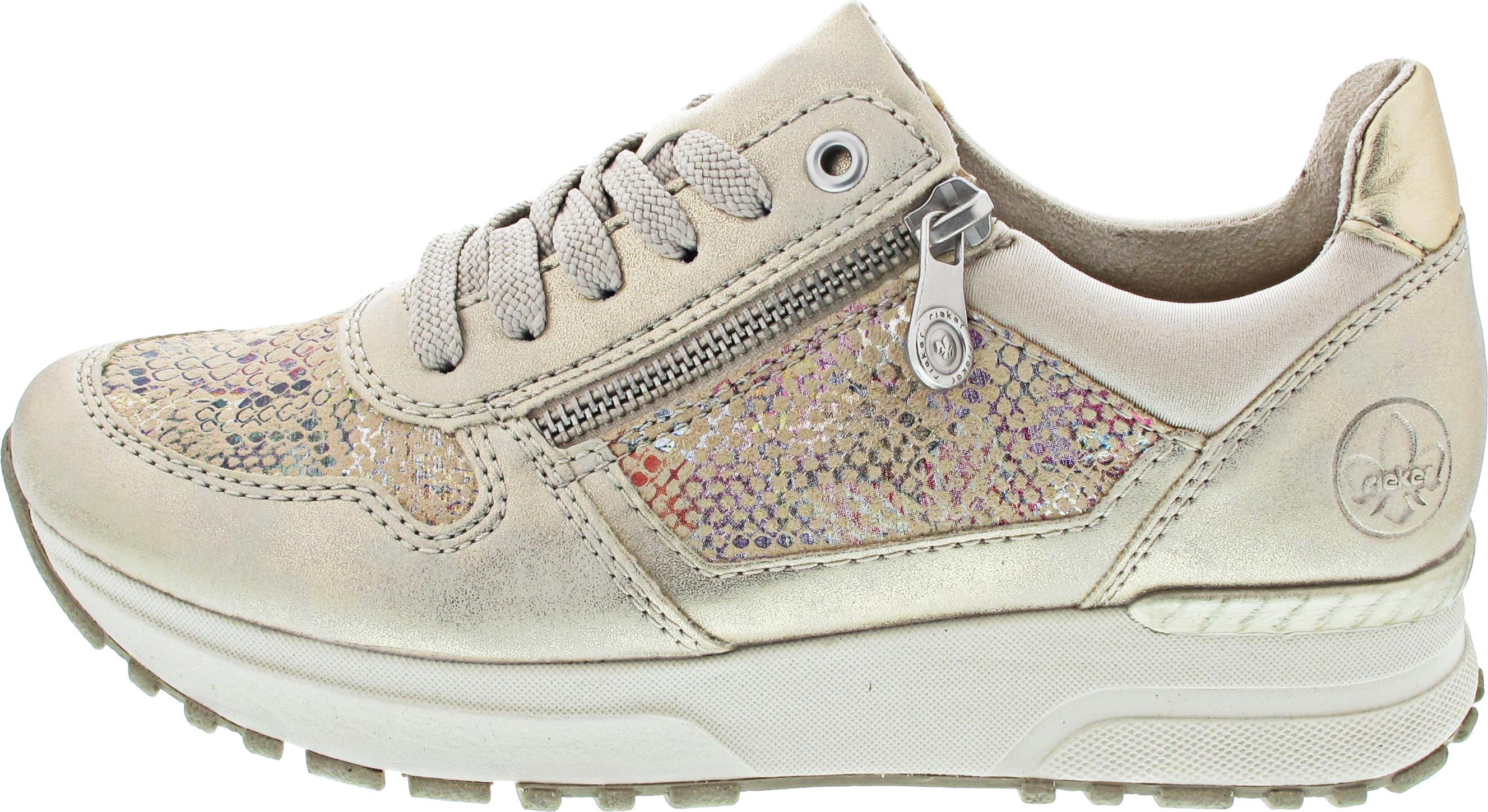 Rieker - Laufsohle: flexibel, rutschhemmend - herausnehmbare Lederdecksohle - für lose Einlagen geeignet - mehr Platz dank verbreiterter Brandsohle - trendiger Sneaker mit seitlichem Außenreißverschluss - Schaftrand gut gepolstert - cooler Metallic-Look