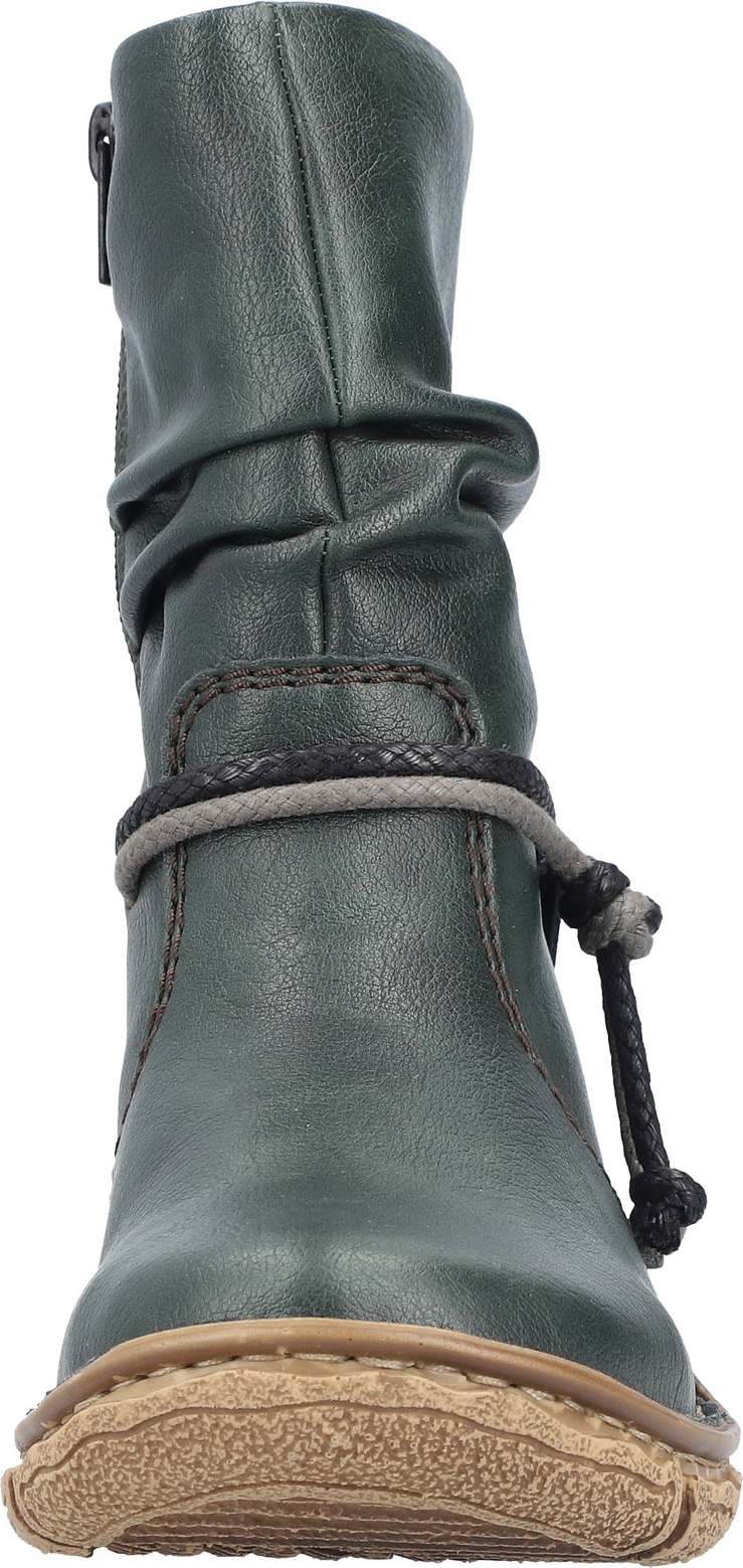 Modisch und bequem durch den Herbst und Winter, geht es mit diesem schönen Damen Winterstiefel von Rieker.Das Obermaterial ist in einem schönen Grün gearbeitet und wird durch das Zierband um den Knöchel gekonnt in Szene gesetzt.Der Schaft ist leicht in Falten gelegt. +