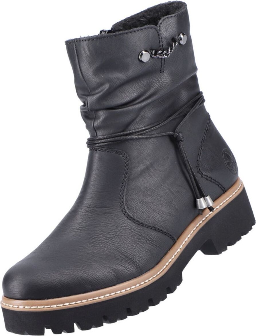 Ein modischer Boots für die Damen von Rieker.Das Obermaterial aus Kunstleder in Schwarz, wird durch ein kleines Zierband um den Knöchel gekonnt in Szene gesetzt.Auch eine kleine Gliederkette verziert den Schaft an der Außenseite.Mit dem seitlichen Reißverschluss ist der Einstieg einfach.Dank des flauschigen Innenfutters, hast du auch an kalten Tagen, warme Füße.Die markante Laufsohle mit Blockabsatz gibt guten Halt und wird mit der Umrandung in Braun toll in Szene gesetzt.