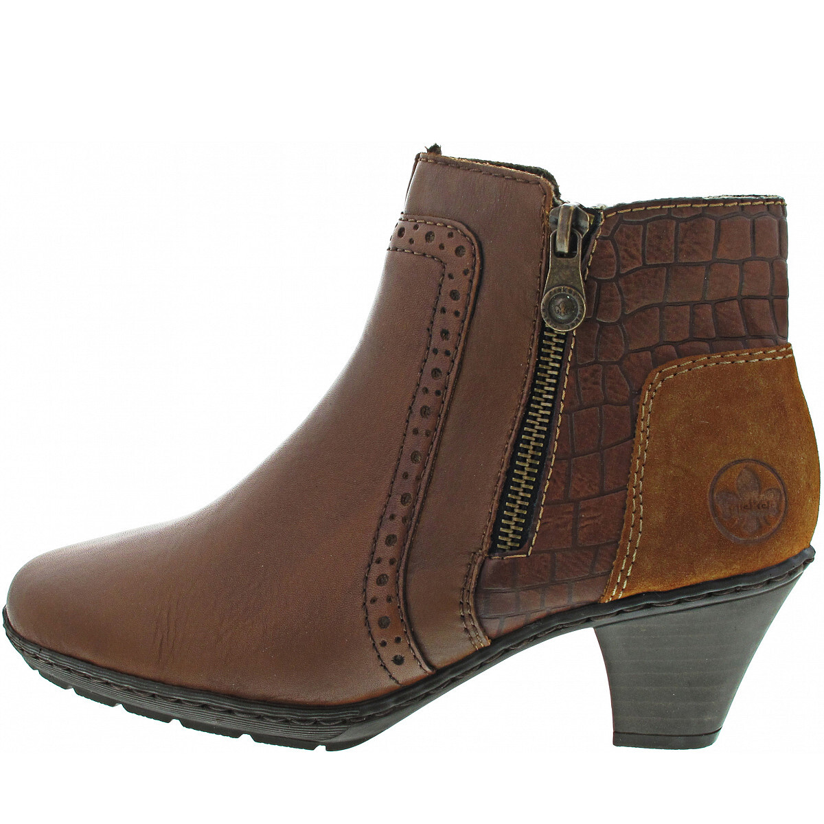 Rieker - stabile Laufsohle, profiliert und leicht - wärmende Fleece-Decksohle - mehr Platz dank besonderer Rieker-Antistress Passform - Schockabsorption - Absatz in Holzoptik - Reißverschluss an der Innenseite - dekorativer Zipper an der Außenseite - hoher Tragekomfort - Stiefelette für kalte Wintertage