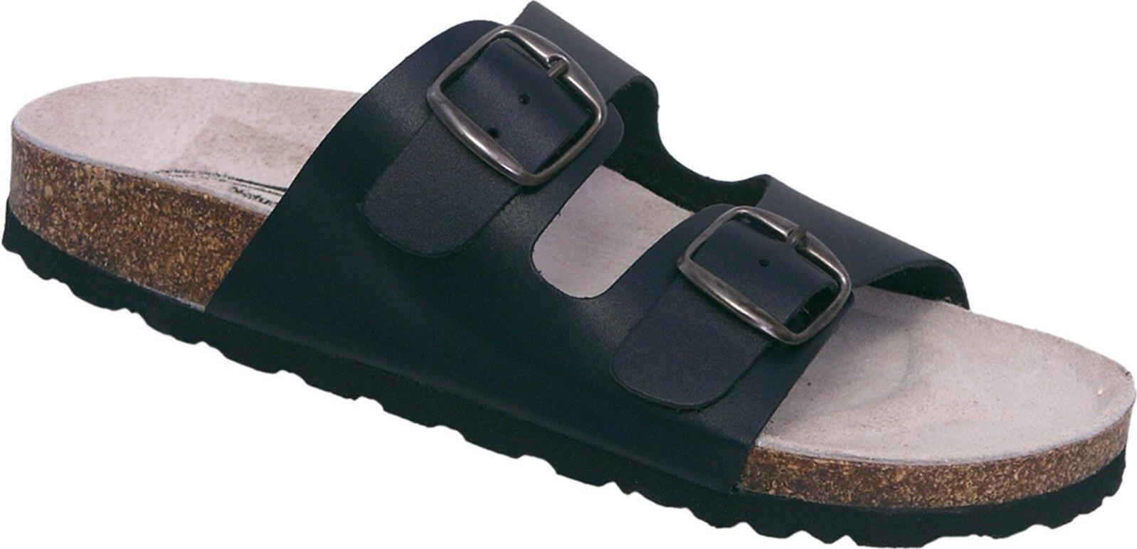 Eigenschaften: - 2 verstellbare Schnalle- Kork mit Lederdecksohle- EVA-Laufsohle Material: PekoflorFarbe: schwarz Größen: 36-48
