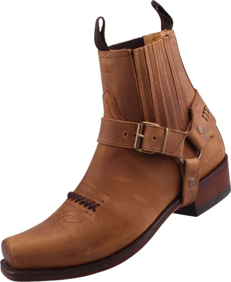 Mit der eckigen Spitze und den typischen Lederriemen als Stiefelschmuck zeigt sich der Stiefel in einer klassischen Aufmachung. Die beidseitig angebrachten tiefen Gummizüge sind durch Lederstreifen verdeckt und machen den Einstieg leichter.
