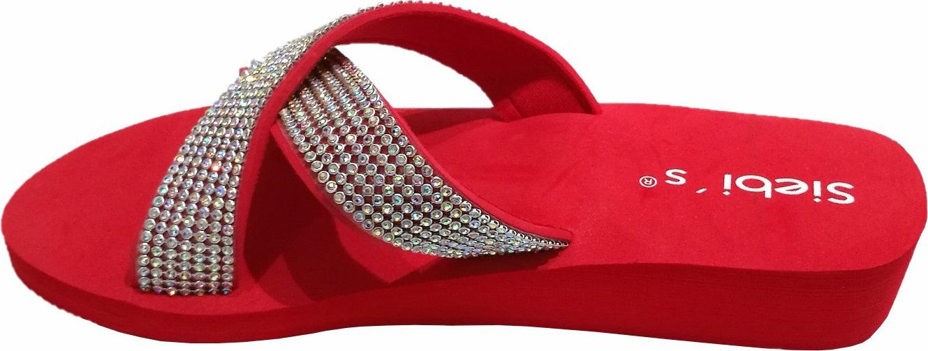 Rote Plateau-Sandale mit glitzernden Strassverzierungen auf dem Riemen. Offenes Zehen-Design, zwei überkreuzte Riemen über dem Spann, flache Plateausohle.