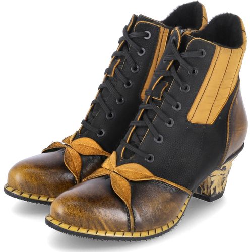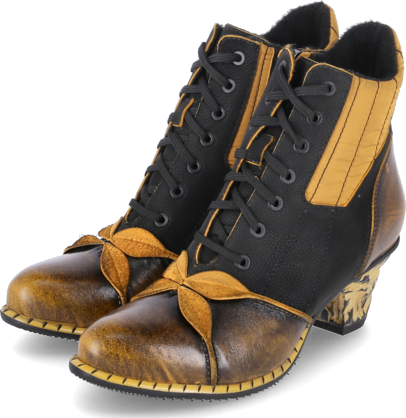 Ein richtiger Hingucker ist die gelbe Stiefelette von Simen! Das Design mit Blütenblattverzierung peppt jedes Outfit auf. +