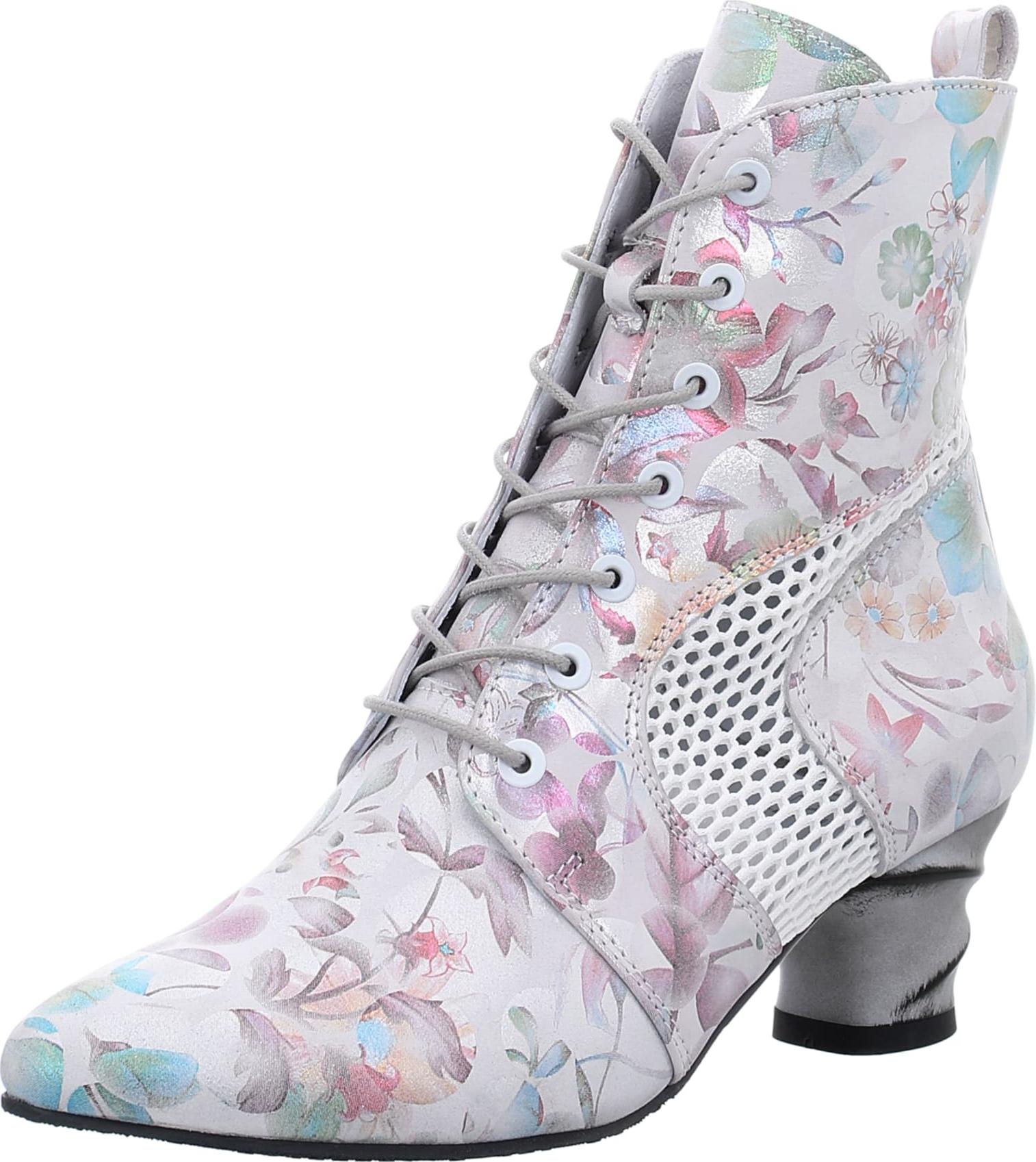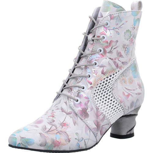 Ausgesprochen feminin und chic ist diese außergewöhnliche Damen Schnürstiefelette von Simen.Sie wurde aus weichem Echtleder in Grau gefertigt und mit einem tollen Print verziert, der im Licht toll schimmert. +
