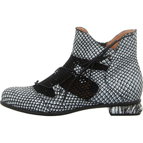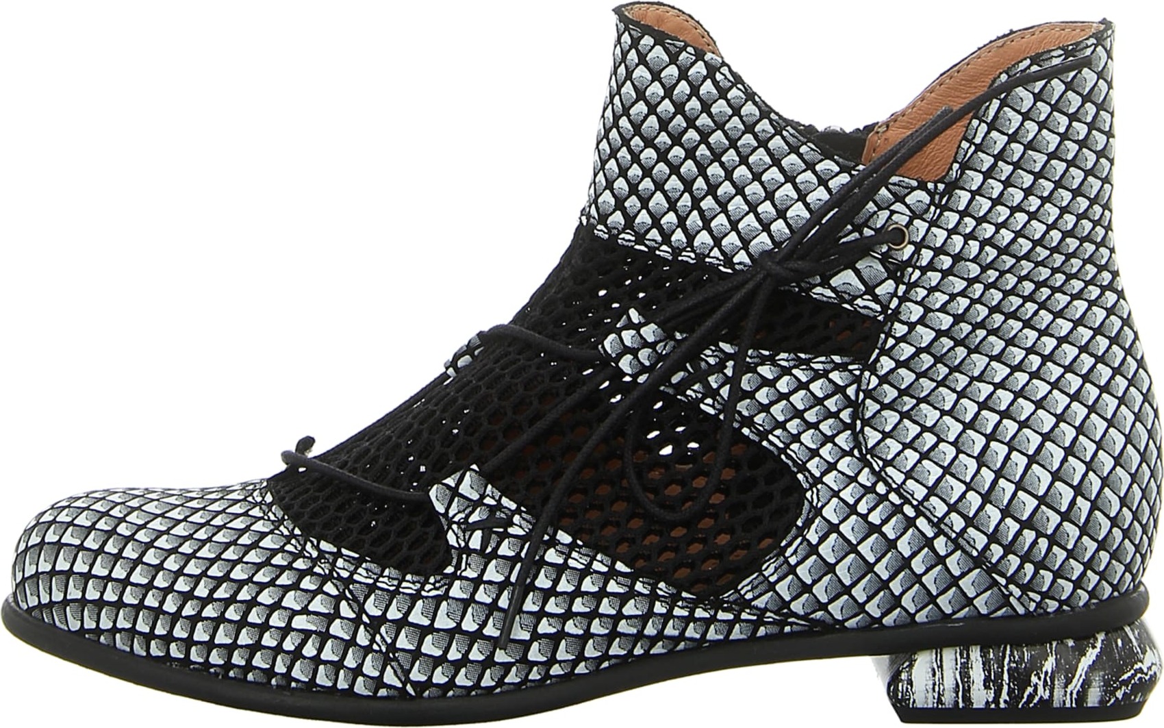 Ein richtiger Hingucker ist die schwarz weiße Stiefelette von Simen! Das Design mit dem stylischen Mustern und dem luftigen Netzeinsatz peppt jedes Outfit auf. +