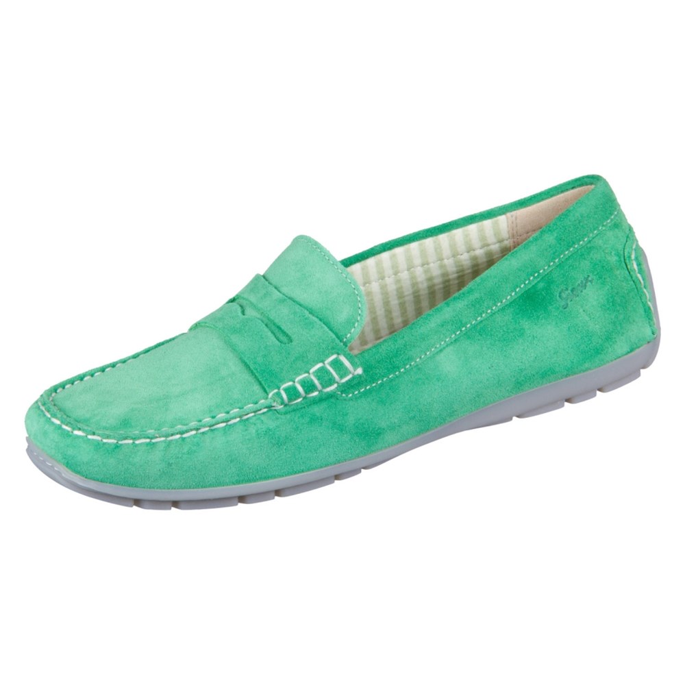Durchgehend textilgefüttert, mit weich gepolsterter Decksohle zum Herausnehmen und Austausch durch eine eigene Einlage. Weiche, flache Autofahrer-Gummisohle, die an der Ferse hochgezogen ist.