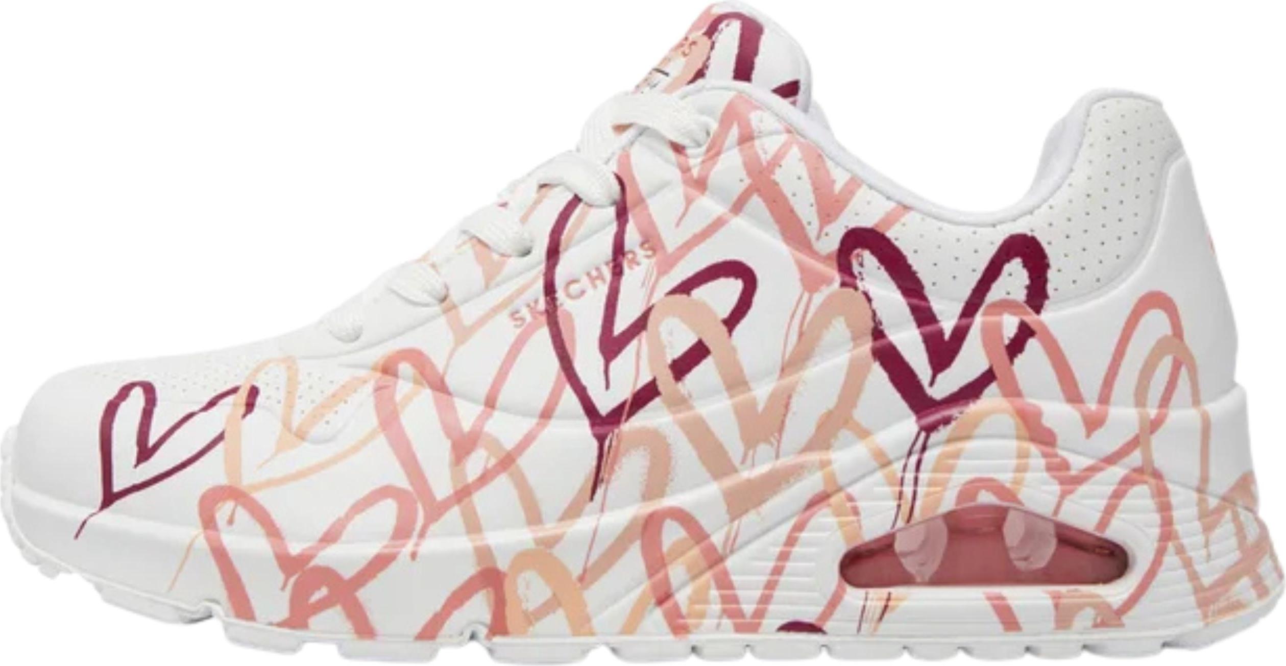 Lassen Sie sich von unseren Skechers UNO-SPREAD THE LOVE Wedgesneaker verzaubern! Mit ihrem auffälligen Graffiti-Print in den Trendfarben Weiß und Rosa sind sie ein echter Hingucker. Die Kombination aus Lederimitat und Textil sorgt für einen besonders angenehmen Tragekomfort. +