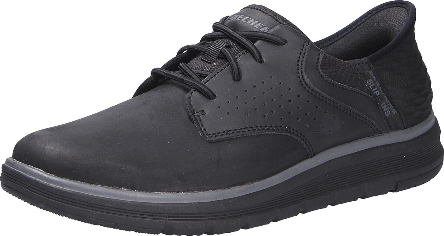 Marke: SkechersModell-Nr.: 205249 BLKModellname: ORELL - YATESArt: Herrenschuhe - Slipper - Halbschuhe, HANDS FREE SLIP INSFarbe: schwarz +, Rahmen in dunkelgrau (black)Obermaterial: Echtleder +, Synthetik (Fettleder)Innenfutter: TextilInnensohle: Textil Komfort Fußbett, Air Cooled Memory Foam - gogamat® ARCHWechselfußbett: nicht herausnehmbare InnensohleLaufsohle: Gummi +, Polyurethan (PU) - extra leichtVerschluss: Gummizug - ohne VerstellmöglichkeitAbsatz: flach - kein AbsatzSchuhform: rundGrößenangabe: fällt normal ausWeitenangabe: G - normal Weiteinterne Artikelnummer für Ihre Rückfragen: 148-00-0095