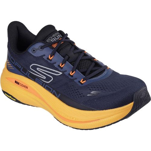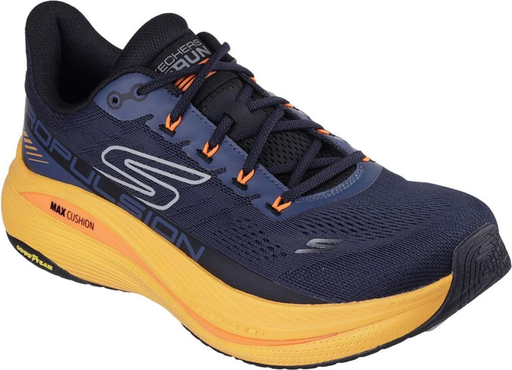 Marke: SkechersModell-Nr.: 220509/NVORModellname: MAX CUSHIONING PROPULSIONArt: Herrenschuhe - SportschuheFarbe: dunkelblau +, orange (navy/orange)Obermaterial: Textil (Maschinen Waschbar)Innenfutter: Textil - weich gepolstertInnensohle: Textil Komfort Fußbett, Air Cooled GOGA MAT®Wechselfußbett: nicht herausnehmbare InnensohleLaufsohle: PU-Laufsohle mit Gummi Einsätze, GOODYEAR Performance - rutschfest, max DämpfungVerschluss: 5fach SchnürungAbsatz: flach - kein AbsatzSchuhform: rundGrößenangabe: fällt normal ausWeitenangabe: G - normal Weiteinterne Artikelnummer für Ihre Rückfragen: 102-81-0023