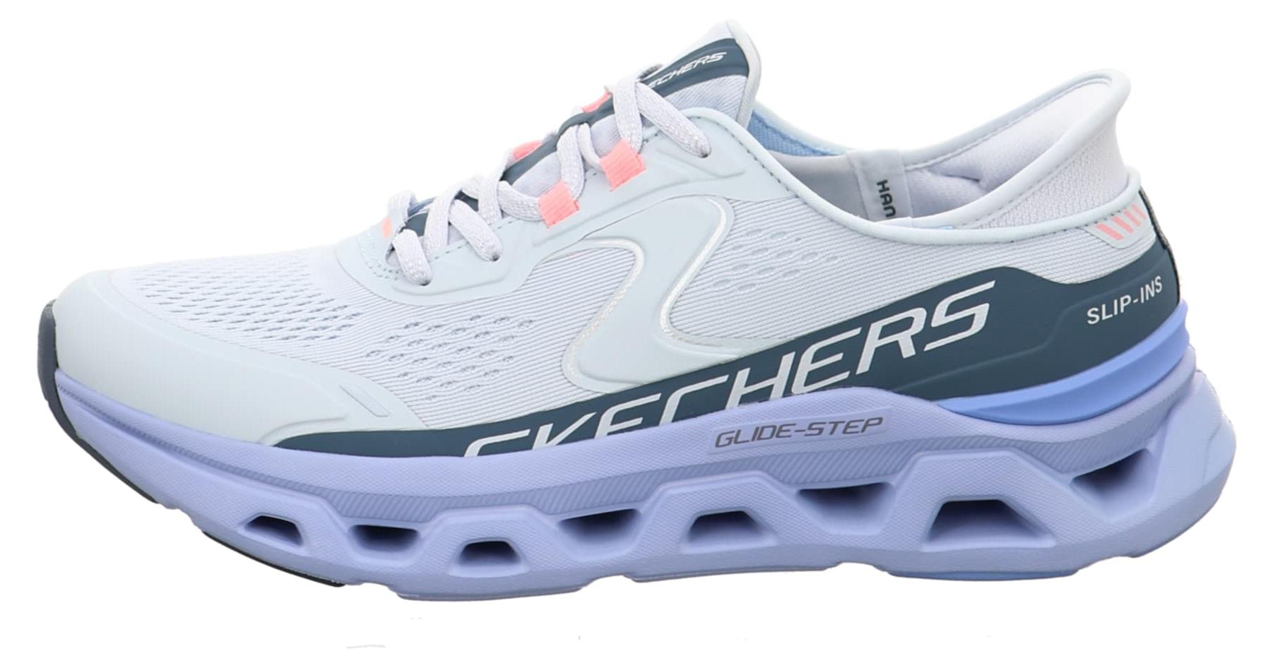 Der Glide Step Altus aus dem Hause Skechers ist ein auffallend sportiver Sneaker für Damen aus der Hands Free Slip Ins Kollektion.Du kannst den Schuh durch die gepolsterte Einstieghilfe an der Ferse ganz ohne Zuhilfenahme deiner Hände anziehen.Gefertigt wurde der Schuh in einem Mix aus luftigem Mesh und stabilierenden synthetischen Einsätzen in Hellblau.Kleine Details in Rosa und Silber runden den Look ab. +