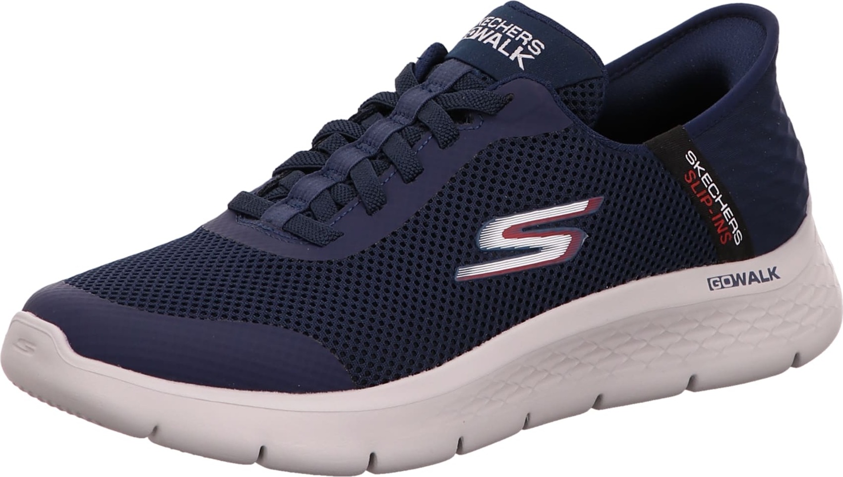 Der Skechers Go Walk Flex-Hands Up Slip-On Sneaker in Navy ist der perfekte Begleiter für alle, die Komfort und Stil schätzen. Der sportliche Schuh in Größe 43 überzeugt nicht nur durch sein ansprechendes Design mit Logodruck und Zierschnürung, sondern auch durch seine praktischen Eigenschaften. +