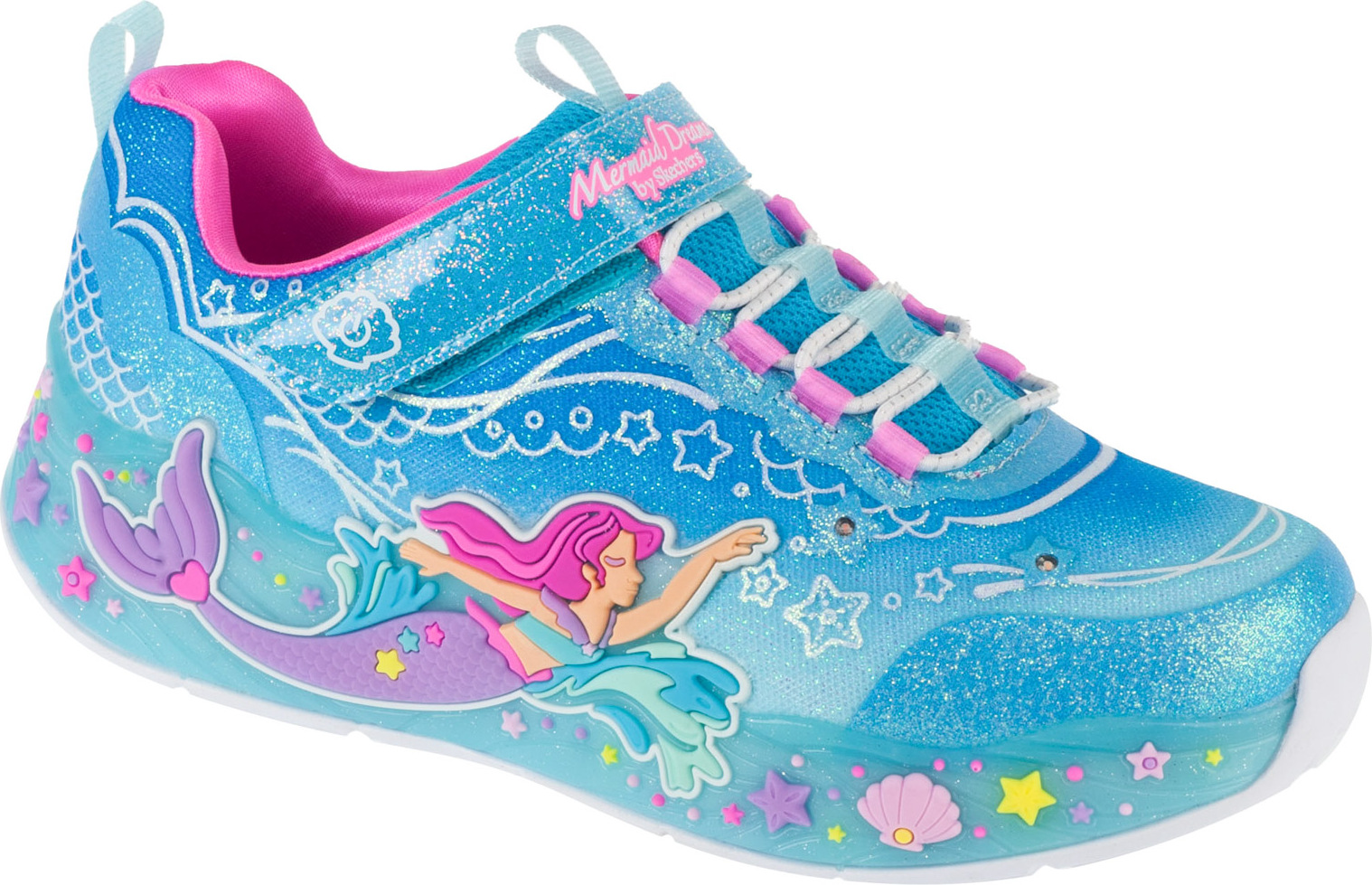 Entdecke die magischen Skechers Meerjungfrauen-Blinkschuhe für Mädchen Diese bezaubernden Skechers Sneaker sind perfekt für kleine Meerjungfrauen-Fans! Das Design in strahlendem Blau mit funkelnden Meerjungfrauen- und Meereselementen verleiht jedem Outfit einen Hauch von Magie. +