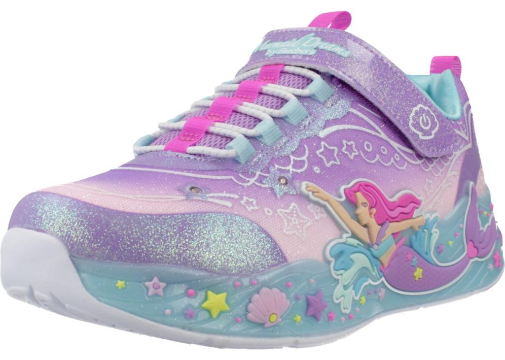 Die strapazierfähige Sohle gewährleistet sicheren Halt, ideal für aktive Tage voller Entdeckungen. Mit den Skechers Meerjungfrauen-Blinkschuhen wird dein Kind zum strahlenden Mittelpunkt und genießt die perfekte Kombination aus Stil und Funktionalität.