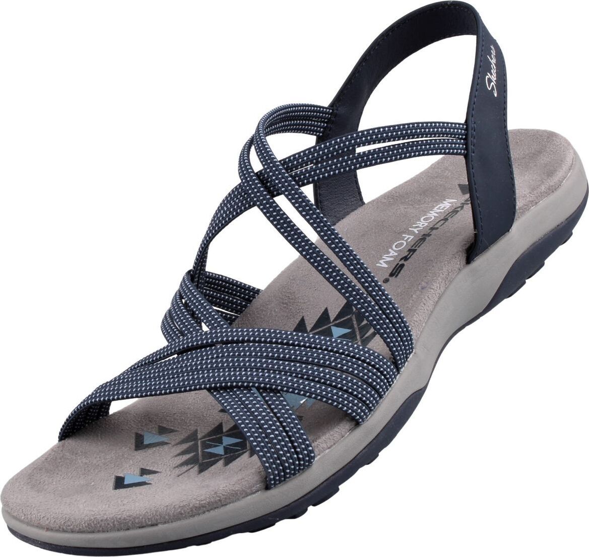 Mit der Skechers REGGAE SLIM TURN IT UP Sandale in navy setzt du auf einen absolut sportlichen Look, der dich perfekt durch den Sommer bringt! Die blauen elastischen Riemchen sorgen dabei für einen besonders angenehmen Tragekomfort und eine individuelle Anpassung an deinen Fuß. Das Obermaterial aus Lederimitat und Textil ist dabei nicht nur strapazierfähig und langlebig, sondern sieht auch noch unglaublich stylisch aus. Das Innenmaterial aus Textil und die gepolsterte Innensohle bieten zudem einen bequemen Sitz und ein angenehmes Laufgefühl. +