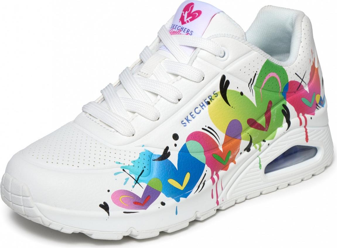 Skechers Uno - Jason Naylor - Decksohle: Air-Cooled-Memory Foam, super weich, passt sich dem Fuß an - optimaler Tragekomfort - flexible Laufsohle, rutschhemmend - Schaftrand und Zunge gepolstert - mit sichtbarer Skech-Air-Luftkissendämpfung - Graffiti-Design „OPN Heart“ des Künstlers Jason Naylor - total trendige Sneaker für Damen - ein echter Hingucker - Must Have