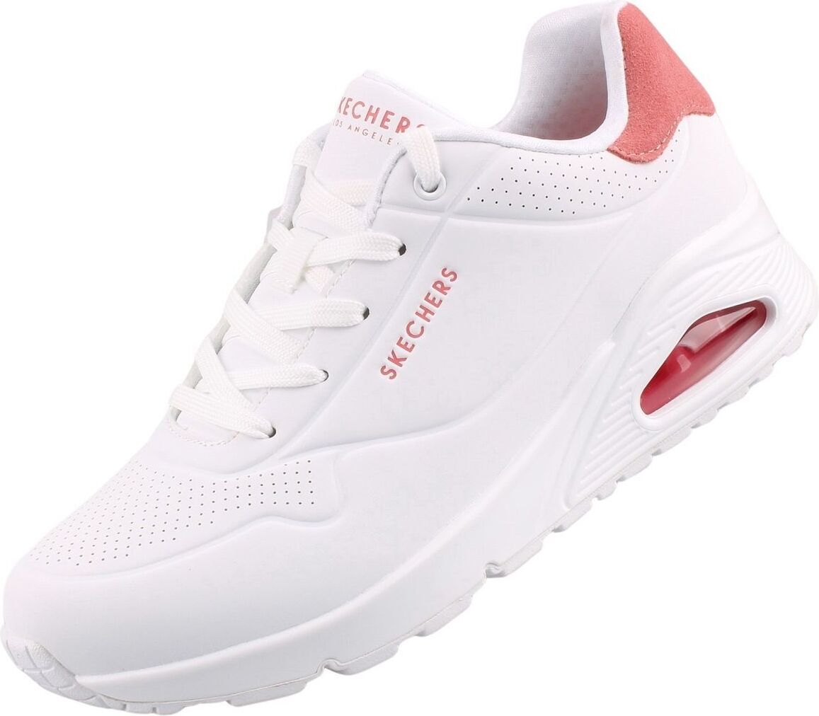 Tauchen Sie ein in ein neues Level des Komforts mit den Skechers UNO - POP BACK Sneakern. Diese weiß-rosa Halbschuhe sind nicht nur optisch ein Hingucker, sondern überzeugen auch mit ihrer Funktionalität. Das Obermaterial aus Lederimitat und Veloursleder verleiht dem Schuh eine hochwertige Optik, während das Textilinnenmaterial für ein angenehmes Tragegefühl sorgt. +