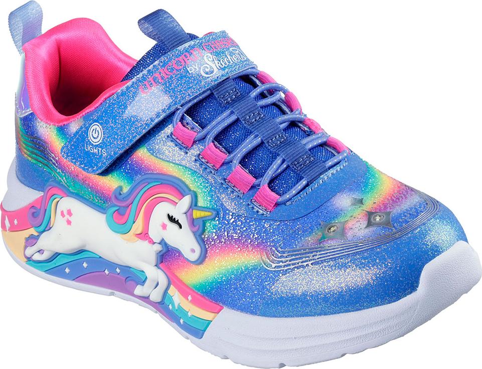 Dieses sportliche Design aus der Magical Collection® verfügt über ein Obermaterial mit synthetischem Glitzerfinish und grafischen Motiven von Einhörnern und Regenbögen an der Seite. Die elastischen Schnürsenkel, der verstellbare Riemen und die gepolsterte Komfort-Innensohle sorgen für perfekten Halt und Bequemlichkeit.