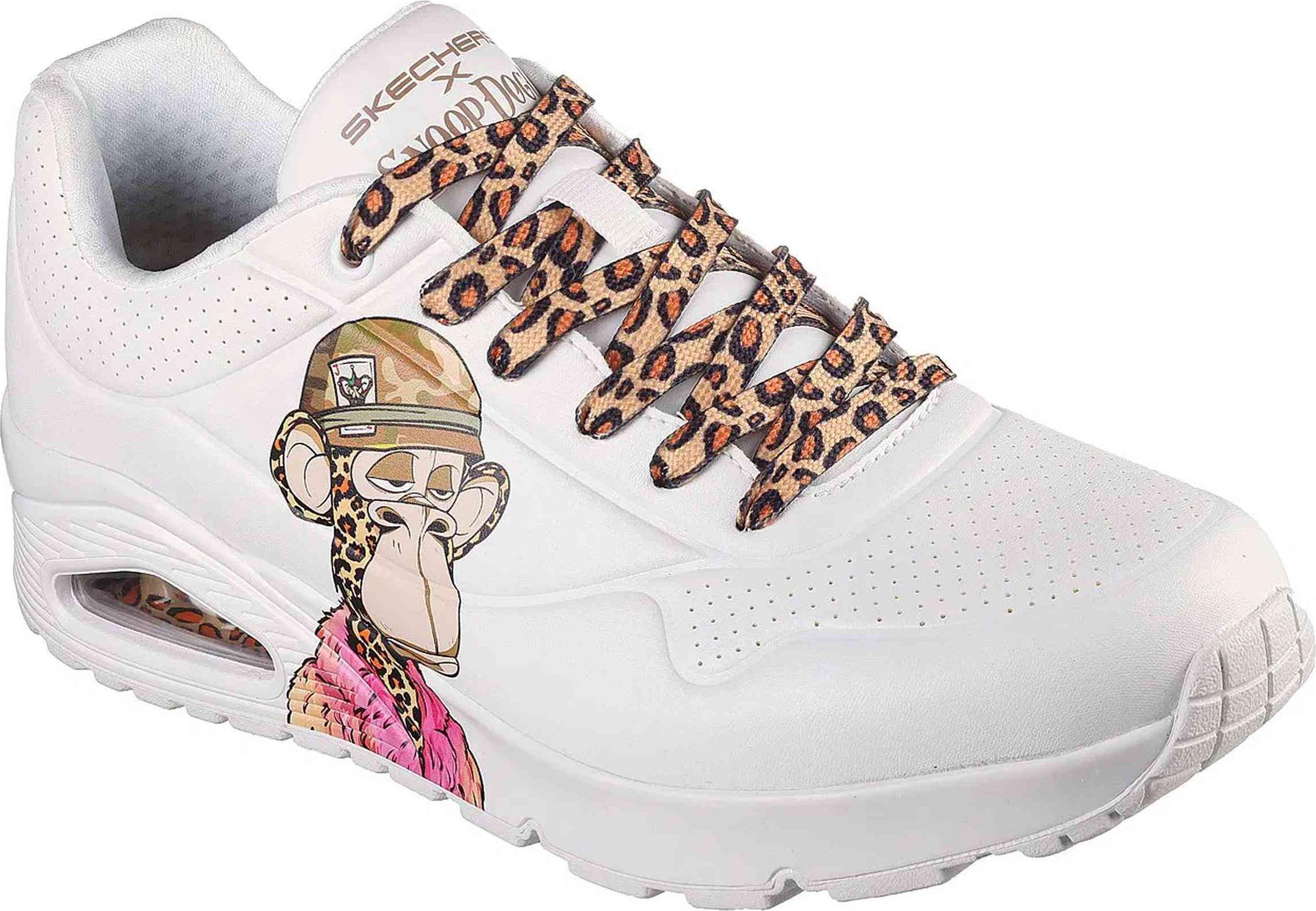 Bombay NFT Skech-Air sichtbare Airbag-Zwischensohle mit Leopardenmuster-Detail Zweite Schnürsenkel - Leopardenmuster und körperfarbene Schnürsenkel Exklusive Sammler-Edition-Verpackung Perforiertes Obermaterial aus synthetischem Durabuck mit Dr. Bombay™-Grafikaufdruck Modischer Schnürsneaker Flexible Traktionslaufsohle 1 1/2-Zoll-Absatzhöhe Skechers und Snoop Dogg Logo-Details
