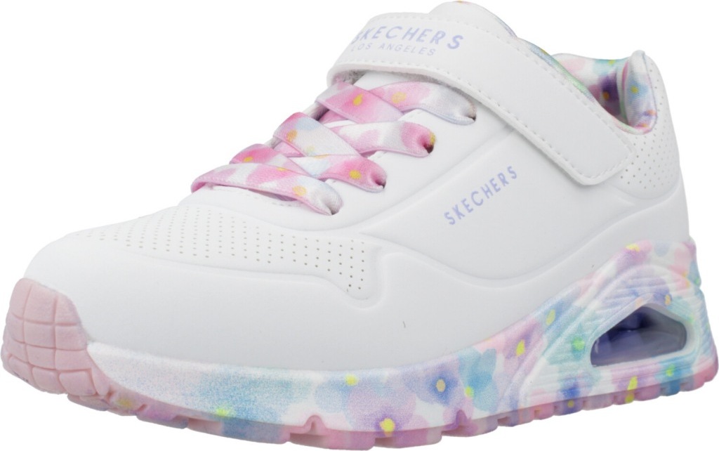 Voll im Trend ist dieser tolle Sneaker für Mädchen von Skechers Street.Das Modell Uno Gen1 Fresh Blooms in Weiß, ist aus Kunstleder gefertigt und mit einem bunten Blumen Print im Innenfutter, auf der Laufsohle und den Senkeln verziert. +