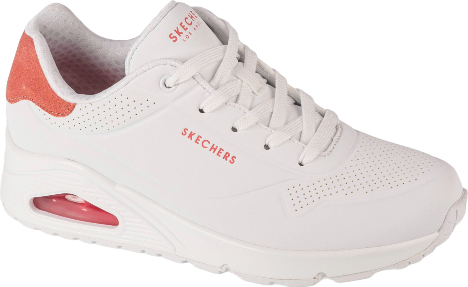 Die erstklassige Verarbeitung und das atmungsaktive Obermaterial sorgen für einen angenehmen Tragekomfort, während die trendige Farbgebung in strahlendem Weiß und lebhaftem Hot Coral Akzente setzt und jeden Look aufwertet.