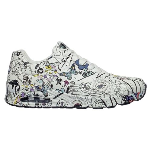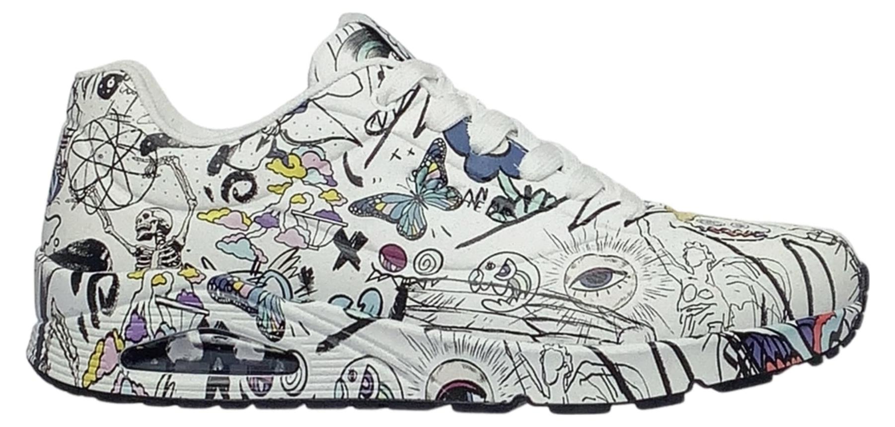 Dieser ist aus der Zusammenarbeit von Skechers und dem Künstler Vexx entstanden. Das Obermaterial aus synthetischem Durabuck in Weiß, ist mit den charakteristischen ",Doodles", von Vexx verziert.
