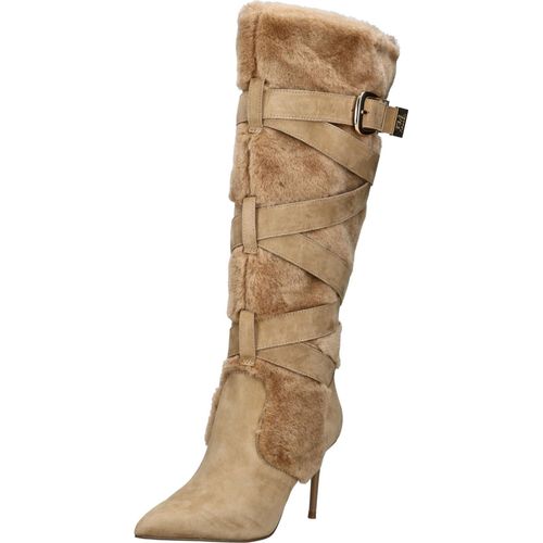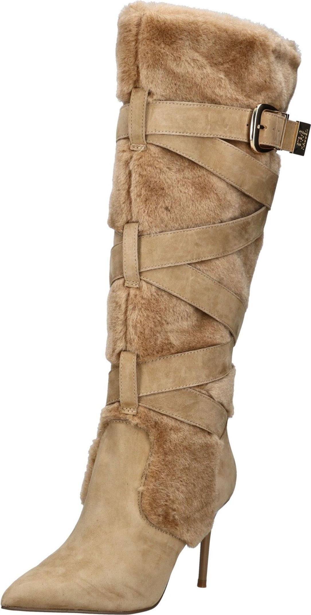Der hohe Schaft ist mit weichem Fellbesatz und dekorativen Riemendetails versehen, die dem Stiefel eine luxuriöse Optik verleihen. Ein schmaler Absatz sorgt für eine elegante Silhouette und streckt das Bein.