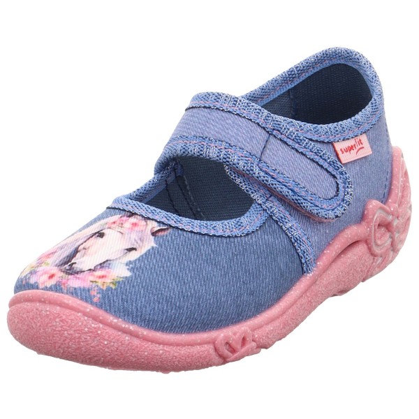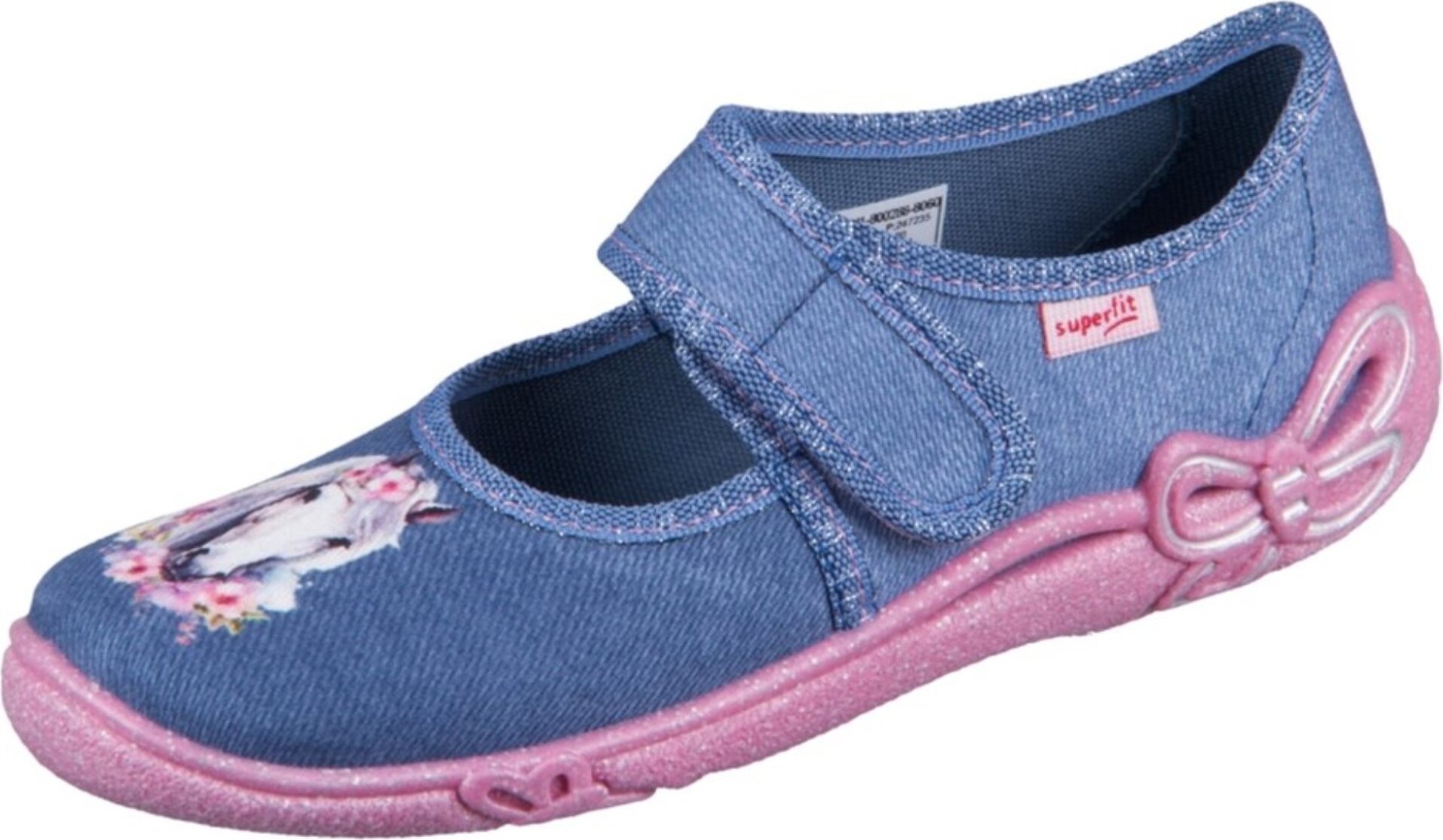 Das Modell Belinda ist ein toller Kinder Hausschuh für Mädchen aus dem Hause Superfit.Gefertigt aus Textil in Blau ist er mit einem Pferd Print mit Blumen verziert. +