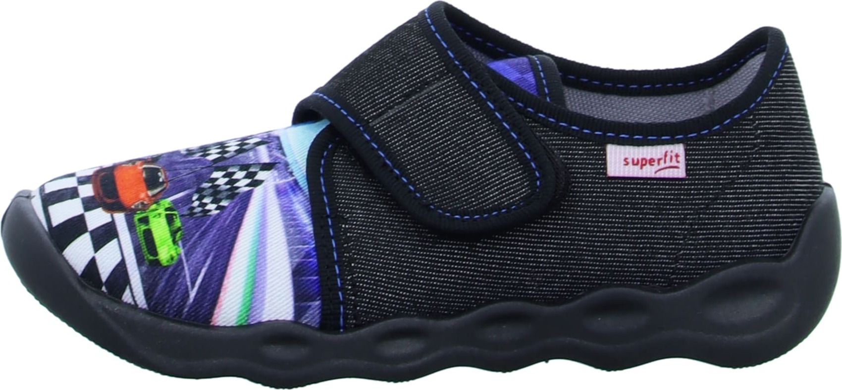 Der Bubble ist ein toller Kinder Hausschuh von Superfit und begeistert jeden Jungen mit seinem coolen Rennfahrer Print und der Aufmachung in trendigem Schwarz. +