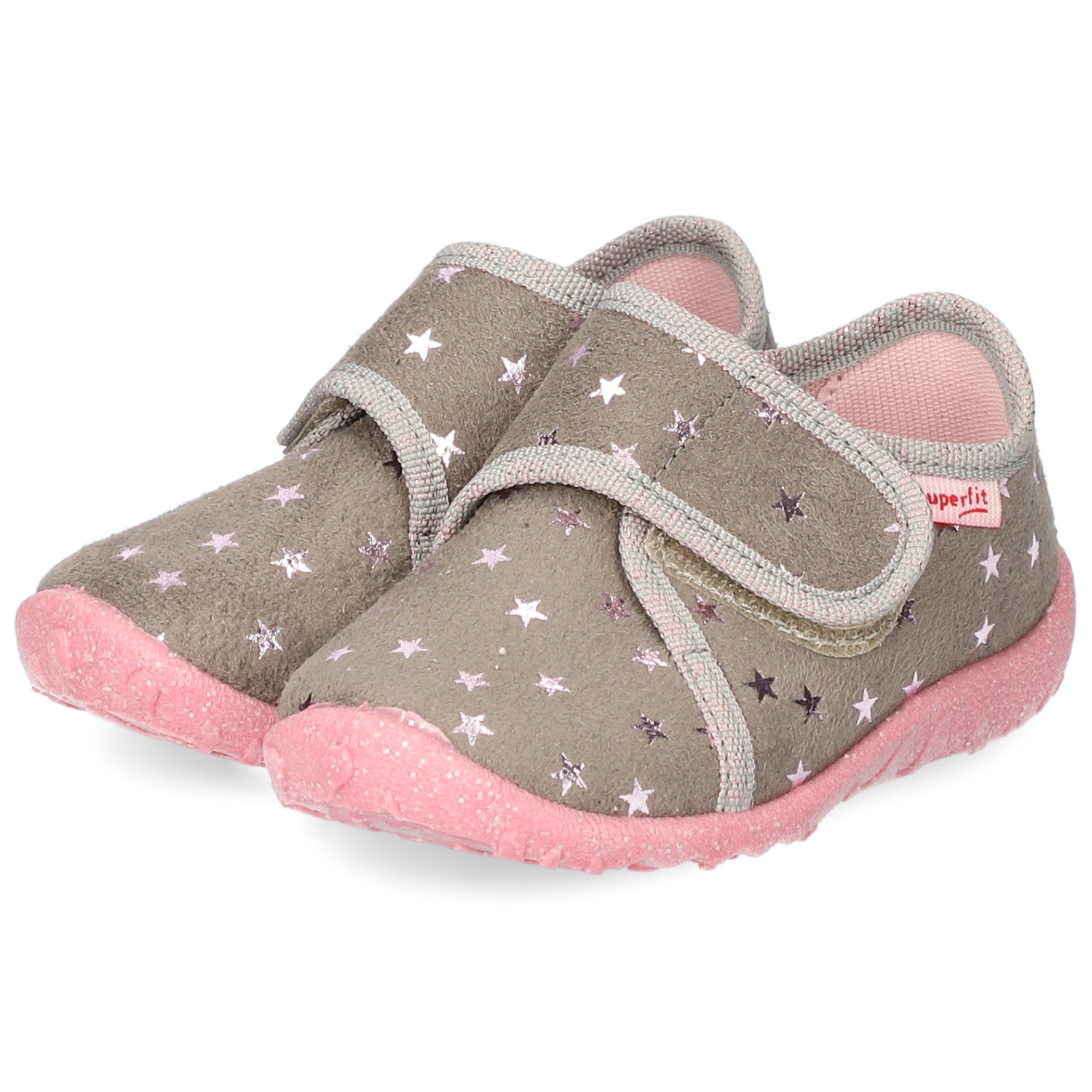 Superfit SPOTTY WMS: Mittel Hausschuh Klettschuh, Kindergarten Schuh mit Motiv, Größenschablone zum Download (grau/rosa)