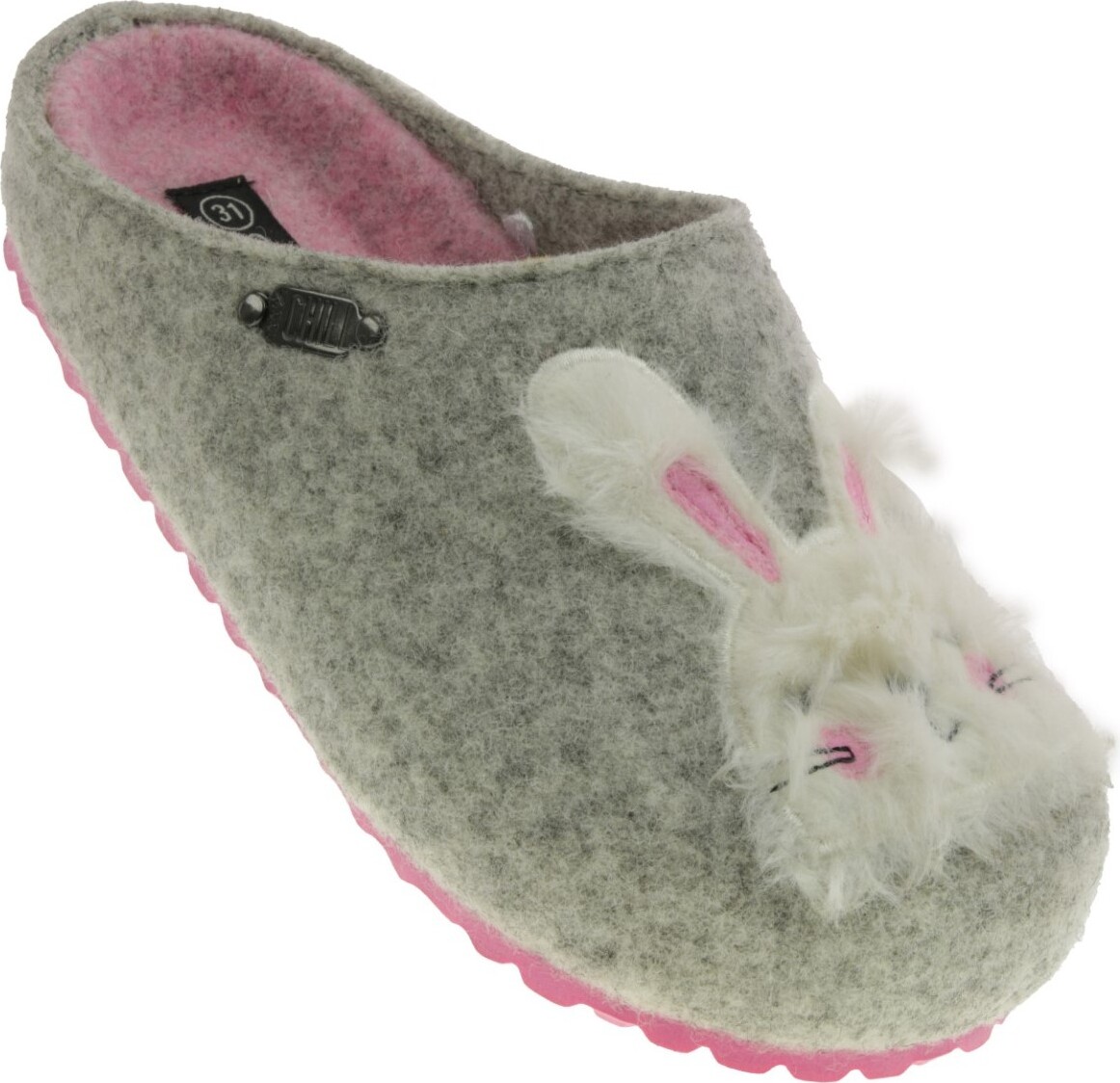 kuschelige Hausschuhe für Mädchen mit einem lustigen Hase als Applikation Material außen: Filz Material innen: Filz geformtes Fußbett Decksohle leicht gepolstert leicht profilierte Laufsohle Farben: Grau oder Rosa