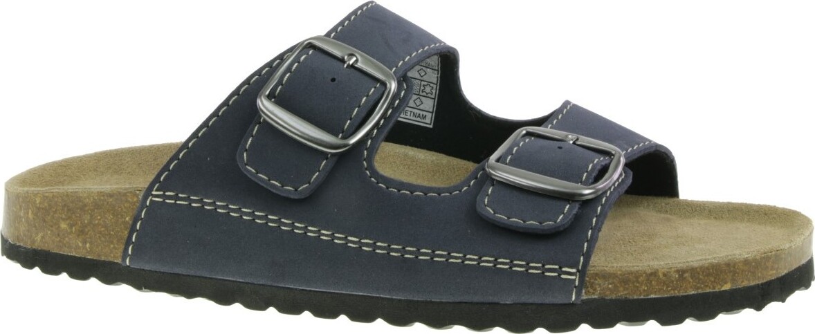bequeme Herren Pantolette, Sandale, Hausschuh ideal für den Einsatz in allen Bereichen des Lebens Material: Lederimitat (Synthetik) durch die Schnalle individuell einstellbar geformtes Lederfußbett eingebettet in einer Korksohle leicht profilierte Laufsohle (TPR) Fraben:blau, schwarz/braun