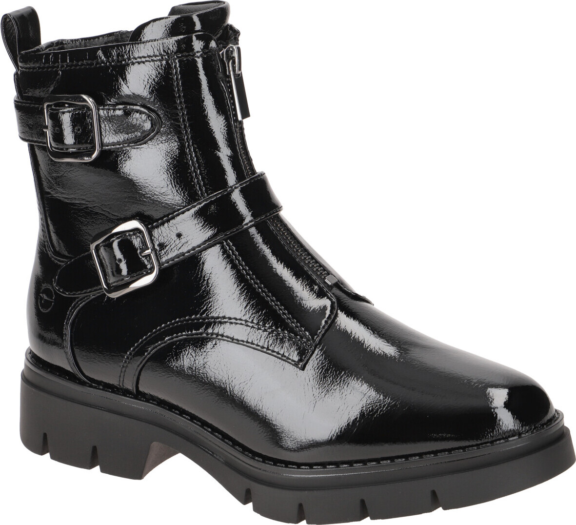 Marke: TamarisModell-Nr.: 1-25817-41 018Modellname: 25817Art: Damen Stiefeletten - bequeme Stiefelette, Chunky BootsFarbe: schwarz glänzend (black patent)Obermaterial: Synthetik (Vegan - Lacksynthetik)Innenfutter: Textil - weich gepolstert, dünn gefüttertInnensohle: Textil Fußbett, Tamaris - Touch-ItWechselfußbett: nicht herausnehmbare InnensohleLaufsohle: Gummisohle, Plateau ca. +
