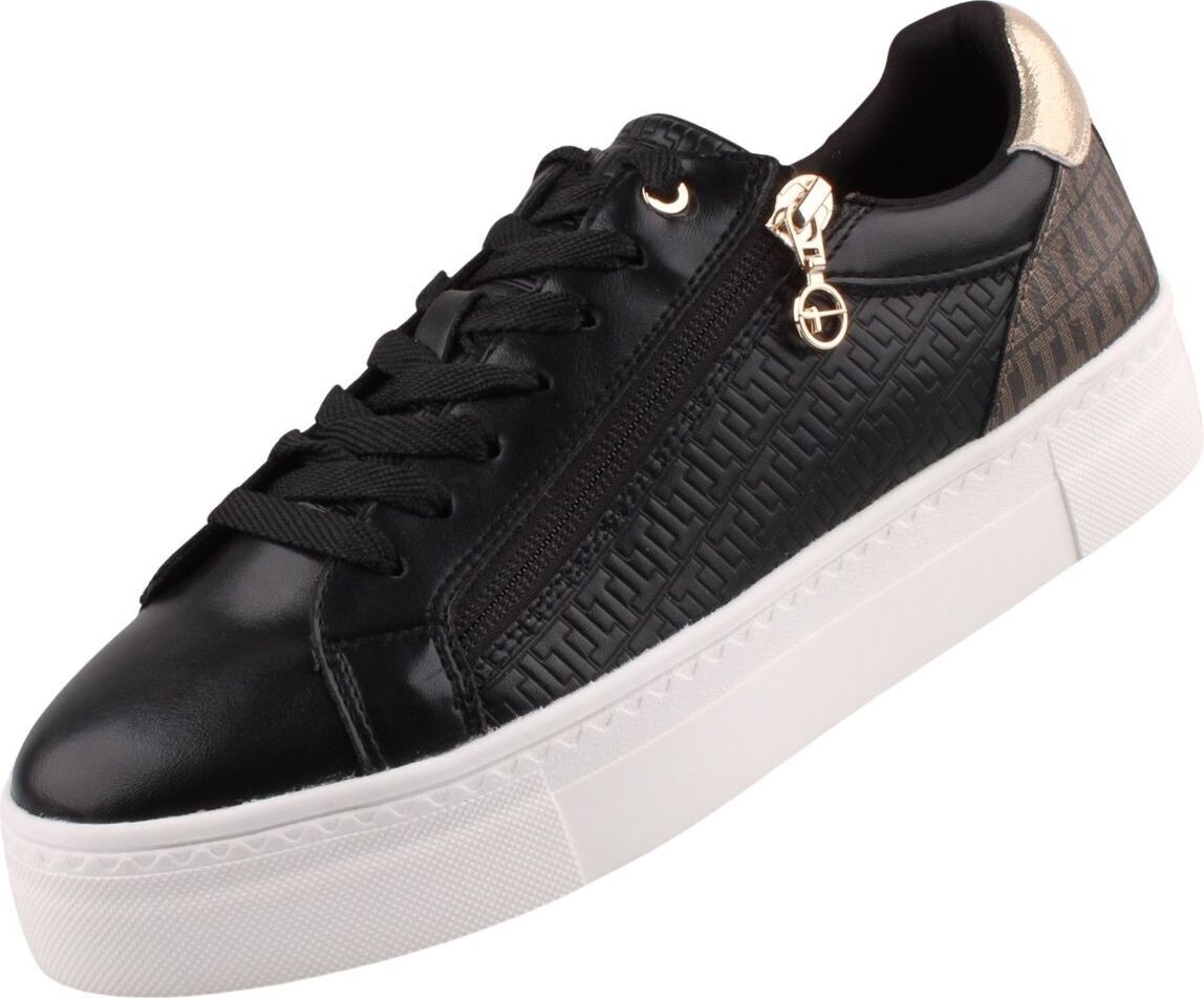 Tauchen Sie ein in die Welt des Glamours mit den Tamaris Plateausneakern in veganer Verarbeitung. Diese atemberaubenden Halbschuhe vereinen Luxus und Nachhaltigkeit in einem trendigen Design. Das Obermaterial aus schwarzem Lacklederimitat mit goldfarbenen Details verleiht diesen Sneakern einen edlen und modernen Look. +