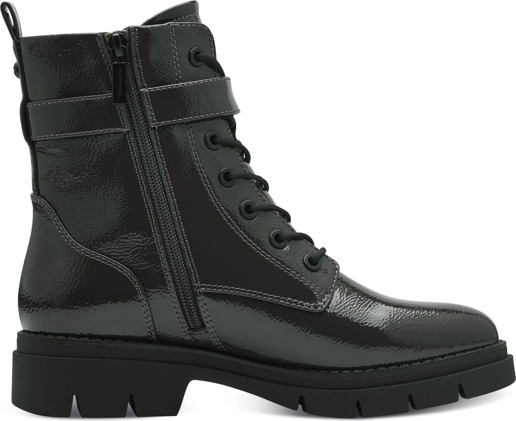Tamaris Damen Schnürboot aus Lacklederimitat in Olivegrün mit Schnürung, Reißverschluss, 4 cm Blockabsatz und einem Futter aus Textil und Synthetik.