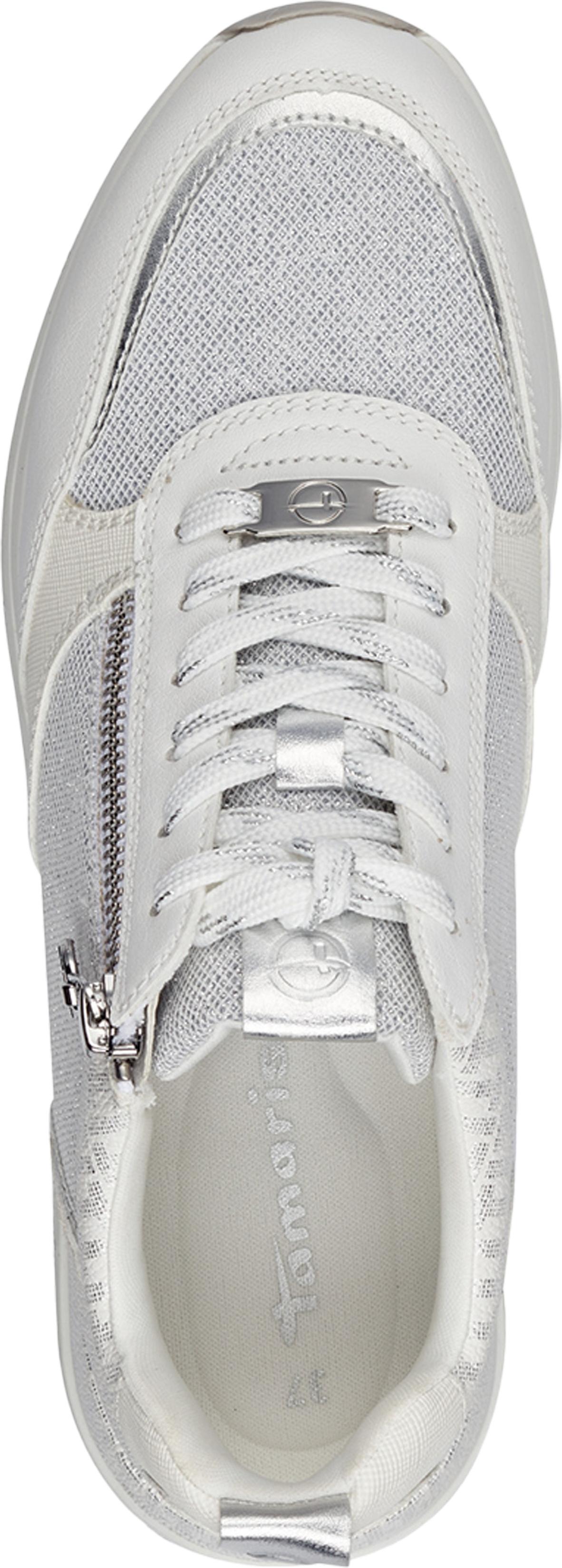 Mit den Tamaris Low Sneaker in strahlendem Weiß und silberfarbenen Glitzerakzenten zeigen Frauen nicht nur Stil, sondern auch Umweltbewusstsein. Die veganen Sneaker aus einem hochwertigen Textil-Synthetik-Mix vereinen modisches Design mit Nachhaltigkeit. +