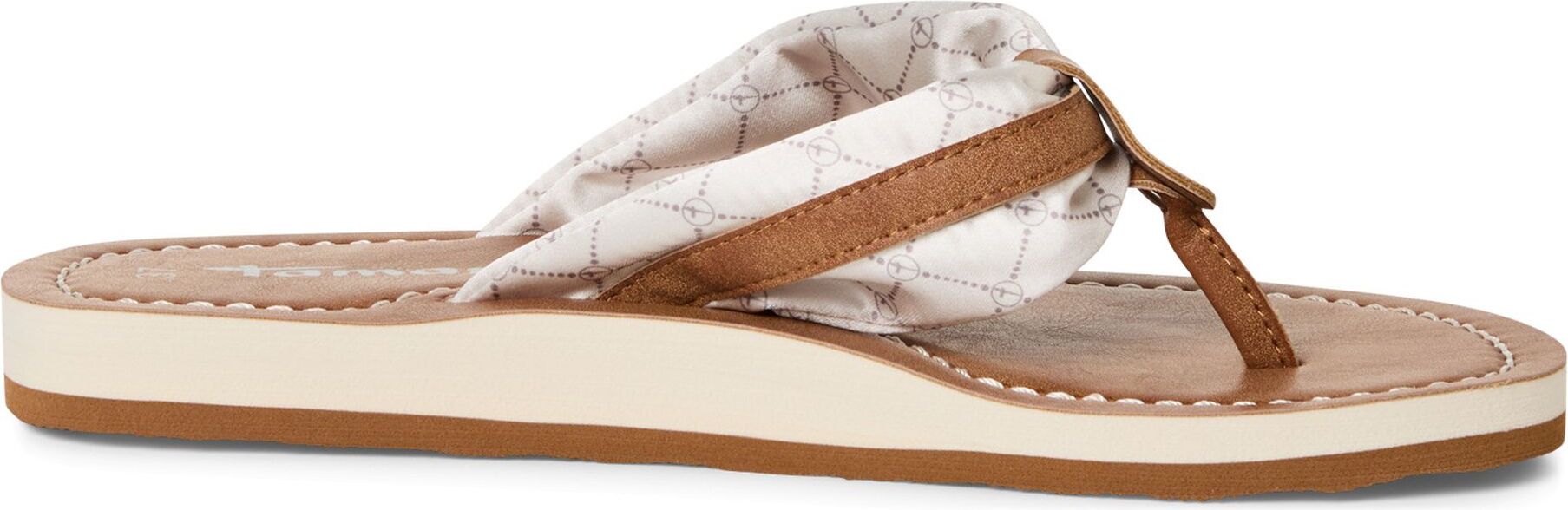 Diese individuell gestaltete Damen Zehentrenner Pantolette aus Kunstleder und Textil von Tamaris ist ein Must Have für den kommenden Sommer.Das Obermaterial in Braun in einem originellen Mix aus einem schmalen Kunstlederbändchen und einem breiten Satinband in Cream Weiß mit grafischem Muster macht diese Zehentrenner einzigartig und zugleich absolut bequem.Durch die seitliche Schnalle mit dem kleinen Anhänger können Sie den Füßen noch perfekt angepasst werden.Ein komfortables Laufgefühl ermöglicht außerdem das weich gepolsterte Fußbett.