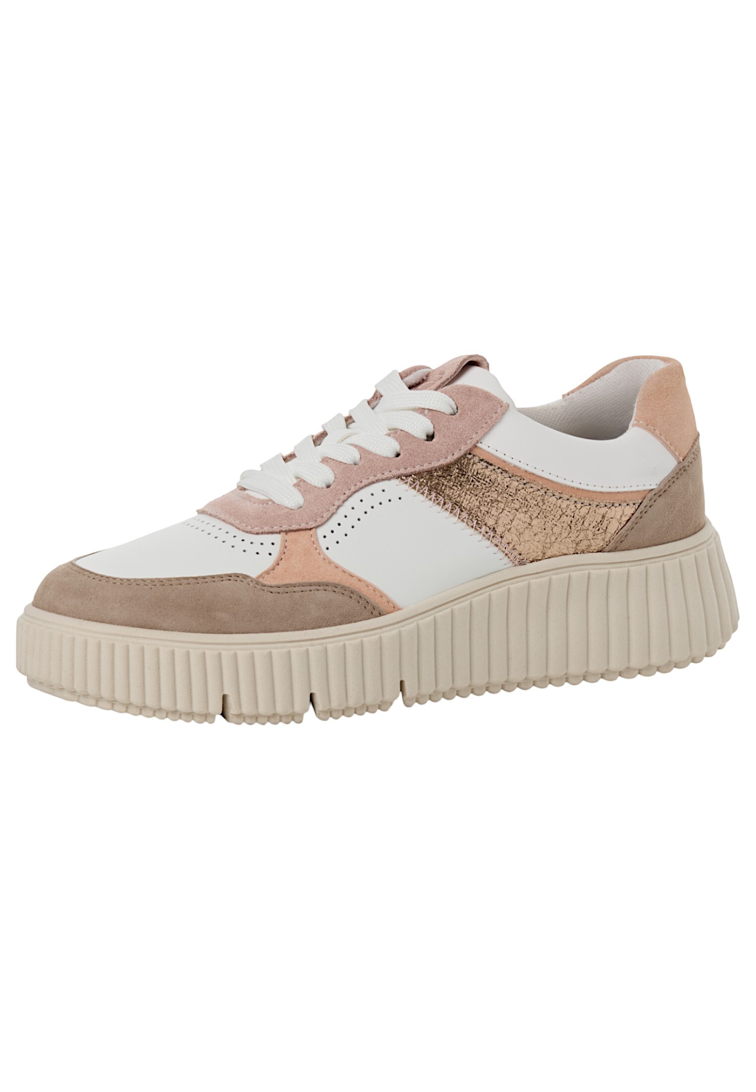 Ihr sportlicher Look vereint eine ansprechende Kombination aus Leder und Textil, während die dicke, strukturierte Sohle Stabilität und Komfort verspricht. Mit stimmigen Farbtönen wie Weiß, Beige und Rosé sowie markanten Designelementen wie Schnürungen und metallischen Akzenten verleiht jeder Schritt deinem Outfit das besondere Etwas.