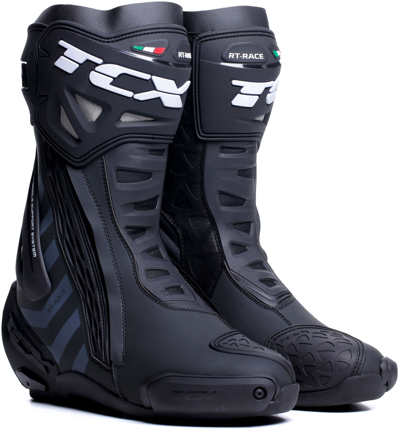 TCX RT-Race Motorradstiefel Herren schwarz / dunkelgrau Vorteile Verhindert eine Überdehnung des SprunggelenksPräzise Passform, die ein hohes Maß an Komfort und Gefühl ermöglicht Eigenschaften Anti-Torsion D.F.C Double Flex-Kontrollsystem zur Verringerung des des Risikos einer Überdehnung des SprunggelenksAuswechselbare, abriebfeste Zehen- und Fersenschleifer aus PolyurethanErgonomische Fersenkappe aus Polyurethan mit austauschbarem seitlichen Magnesium-SchleiferErgonomische Schienbeinplatte aus Polyurethan mit LufteinlässenObermaterial aus MikrofaserAbriebfester Hitzeschutz aus Mikrofaser, um den besten Grip am Motorradrahmen zu bietenWeiche Mikrofaser-Gamasche für verbesserte Winddichtigkeit bei hoher GeschwindigkeitFFC-Schnürsystem (Fasten Fit Control) für verbesserte FahrpräzisionAtmungsaktives Air Tech Mesh-FutterSchaltpolster aus thermoplastischem PolyurethanSeitenverschluss mit Reißverschluss und elastischem EinsatzMikroverstellbare Aluminium-SchnalleOrthoLite®-Fußbett mit Langzeitdämpfung und hoher AtmungsaktivitätVerstärkte Polypropylen-Einlegesohle mit differenzierter DickeLeichte Gummilaufsohle mit differenziertem Design für optimalen Grip auf den Fußrasten