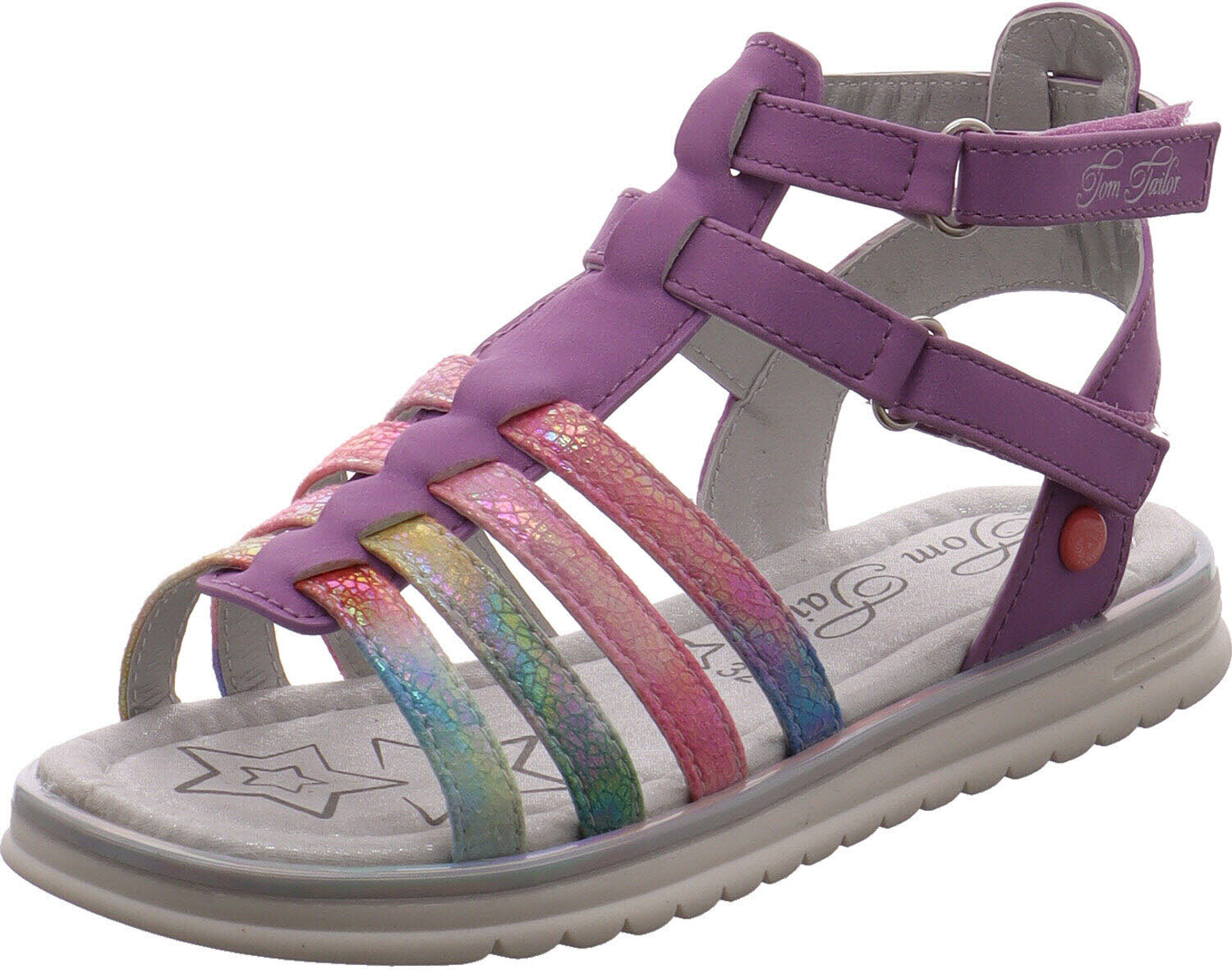 Diese schicke Kinder Sandale von Tom Tailor aus Kunstleder in Flieder Lila ist ein Must Have für Mädchen im Sommer!Die Innensohle glitzert in Silber Metallic und ist mit Sternen verziert. +